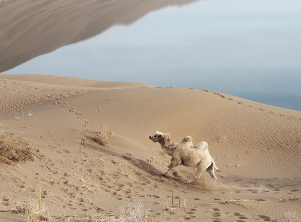 Sur les bords d’un lac, entre glace et cristaux de sel, le sable devient blanc comme la neige. Les touffes d’herbes séchées font un halo jaune subtil. Au centre le bleu émeraude de l’eau rompt avec l’harmonie parfaite et le camaïeu infini qui règne sur ces terres. Les centaines de lacs du désert Badain Jaran sont autant de pupilles tournées vers les cieux. Il semblerait que notre planète est vivante et qu’elle scrute l’espace.