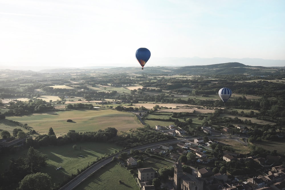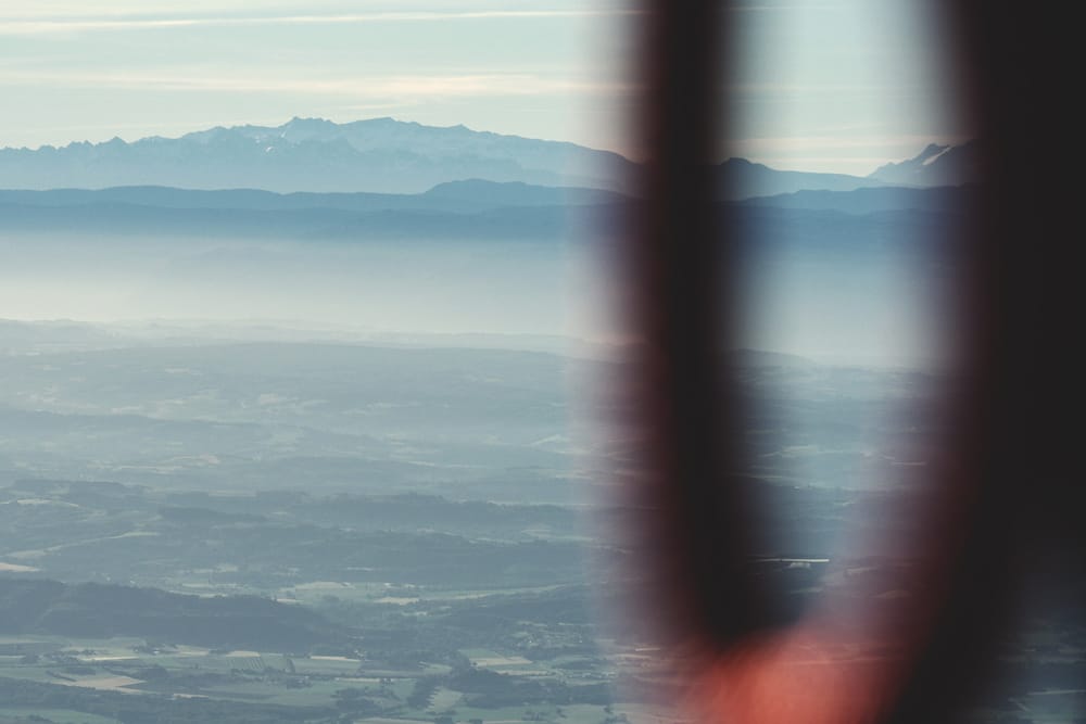 Haut, plus haut, bien plus haut que je ne pouvais l’imaginer. On voit le Mont Blanc se dessiner en contre-jour. 2000 m de vide sous la paille tressée. Je ne savais pas que c’était possible. L’adrénaline rend euphorique, je me sens si bien. 2000 m putain. Je tiens fermement mon appareil photo en dehors de l’habitacle, je ne ressens aucune frayeur mais plutôt une plénitude face au spectacle. Le calme s’est installé à bord. Seul le brûleur fait du raffut. Par moments. C’est une grande émotion que je découvre dans le ciel d’Ardèche. Les deux autres montgolfières semblent danser autour de nous ou bien c’est nous qui changeons constamment de cap. Je perds mes repères dans tout ce bleu.