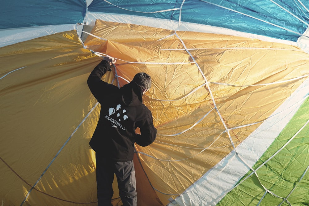 Quelqu’un pour tenir la toile comme ça. Les gars de Montgolfières & Cie, JP et Grégory, s’activent depuis un moment déjà tandis que le jour naît derrière les arbres. Placer la nacelle, dérouler le ballon, l’étaler minutieusement. Ils nous prennent à partie sur la fin des préparatifs.